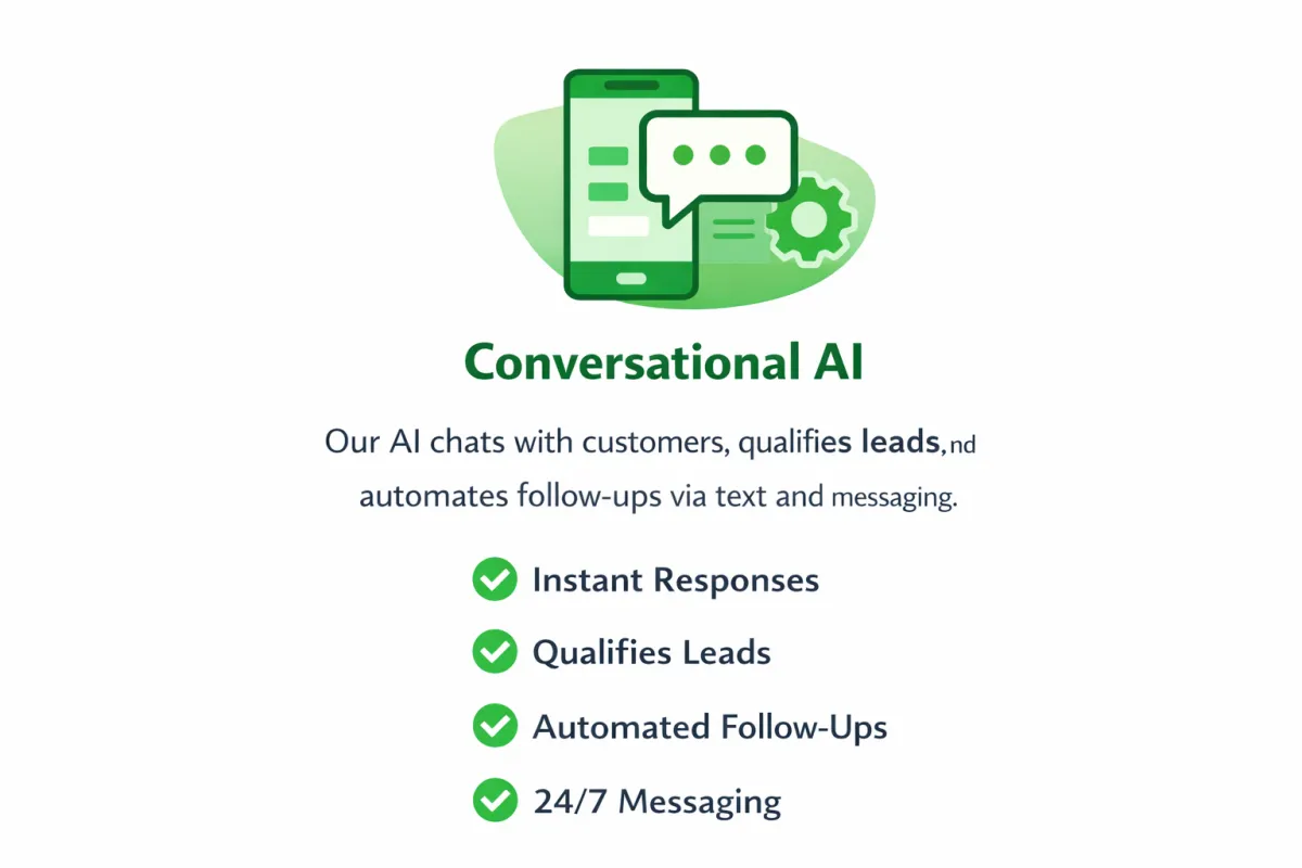 Your AI Receptionist answers incoming calls, while Conversational AI responds to texts, web chat, and customer messages. The system captures customer information, answers common questions, and qualifies leads instantly.